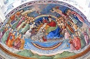 In the lunette above the apse, the Virgin is shown in Heaven after her Assumption. God the Father crowns her in a mandorla formed by a rainbow, surrounded by a heavenly choir. The figures in the bottom row, which are identified by inscription, are mostly prophets: the innermost two are Adam (on the left) and Eve.