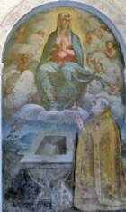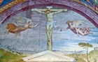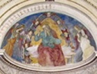 This fresco is in the lunette above the altar. God is seated on clouds within a mandorla. Two angels (one badly damaged) kneel to the sides.