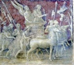 The attribution of the frescoes in the chapel to Pintoricchio was first made in 1848, but it is now generally accepted. (The frieze described above might have been inspired by that designed by Pintoricchio in ca. 1492 for the Borgia apartments in the Vatican).