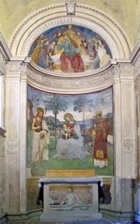 The lunettes on the back wall of this chapel contain a frescoed cityscape of Narni (the native city of the Eroli family), in which the the Rocca and Ponte di Augusto are visible.