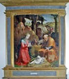 The altarpiece depicts the Virgin and St Joseph kneeling before the baby Jesus, who lies on straw in the stable. There are two associated scenes in the background: