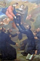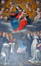 The panel depicts the Madonna and Child in glory, passing rosaries to SS Dominic and Catherine of Siena and [with a pope, a bishop and a number of Rosarians behind them].