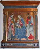 The main panel depicts the Madonna suckling the baby Jesus, flanked by SS Montanus and Bartholomew, the patron saints of Todiano. The scenes in the predella relate to SS Montanus and Bartholomew respectively: