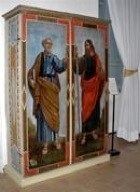 The figures displayed (SS Peter and Paul) were originally on the inside of the doors, and thus stood to the sides of the Crucifix when the tabernacle was open for liturgical purposes. It was more normally closed, when the figures of SS Emilian and John the Baptist on the outer doors were displayed.
