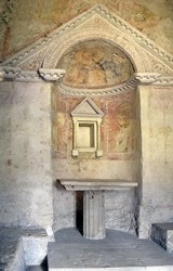 Recent study has demonstrated that the structure was, in fact, always a church, albeit that it may contain re-used architectural fragments from one or more of the temples that stood nearby. It was certainly built after 312 AD (see the description of the aedicule on the east wall below). It might well have been built by a Lombard duke of Spoleto, perhaps in the late 7th century, when the Lombards were finally at peace with the Byzantine emperor. This would account for a Byzantine icon in the conch of the apse (see below).