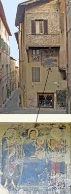 Turn left into Via Sant’ Agata and continue to the junction with Via delle Terme. Take a short detour by turning right for a nice view of the Roman theatre (see below). The street was named “delle Terme” when sporadic finds here before the theatre was excavated led people to the mistaken conclusion that this was the site of the Roman baths . [Palazzo Bartoletti at number 8 contains frescoes (1587) that are the earliest known works by the Perugian artist Benedetto Bandiera.]