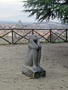 The stone statue (1960) of “Cassandra” by Anna Mahler is at the centre of the piazza.