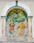 ✴Via Salaria Vecchia, the continuation of the cardo maximus, is opposite. There is an interesting fresco (1375) in the aedicule on the wall of the house opposite (at number 33) that depicts the Madonna and Child enthroned with SS John the Baptist and Bartholomew.