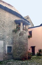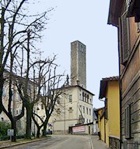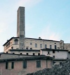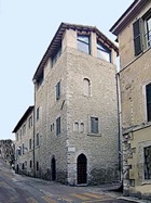 Take the next turn on the right, along Via delle Scuole. There is an interesting tower house on the corner.