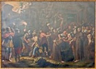 This panel is probably based on one of the prints depicting the scene that were circulated after the beatification. It may have been commissioned after the rebuilding of the apse in ca. 1680. A similar panel from Santa Maria delle Grazie, which seems to have been commissioned by the Nicoletti family, is now in the Pinacoteca Comunale. [I am grateful to Dr. Roy Tepe for sending me much of this information.]