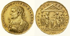 This gold multiple (RIC VI Trier 35, illustrated above) showed two Emperors, almost certainly Diocletian and Maximian, sacrificing outside a temple that Philip Hall (referenced below, at p 26) identified as the Capitoline Temple (because of its six columns, of which four are depicted, and the oak wreath in its pediment). Constantius also used this reverse design on another coin (RIC Trier 617), which he minted after his elevation to the rank of Augustus. As Philip Hill observed: