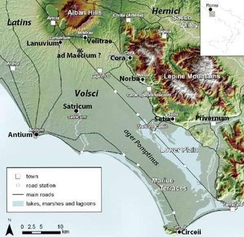 “... the dry land between [the coastal marshes] and the [Lepine Mountains]: that is, the territory of Norba, Setia and Circeii.”
